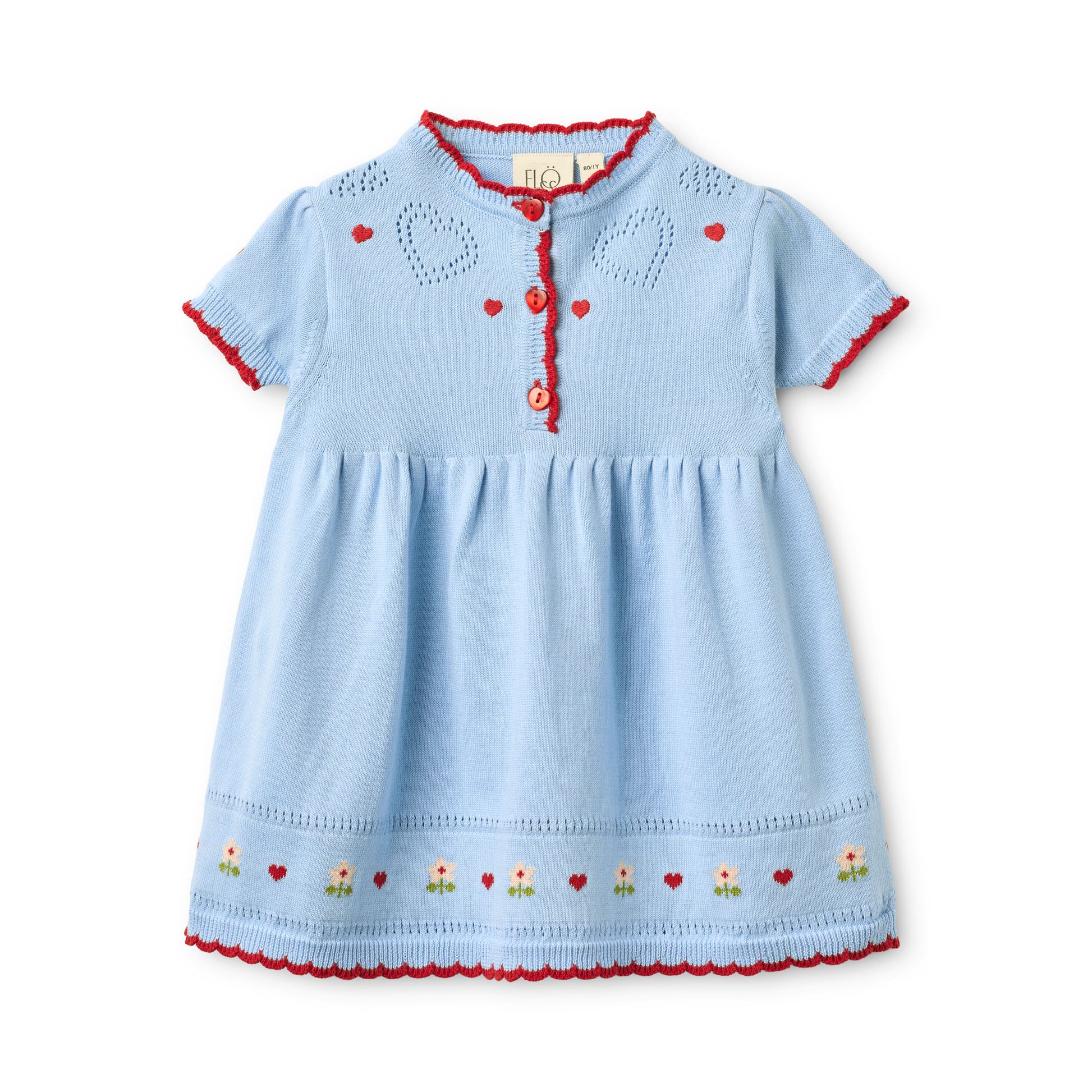 Das Blanca Kleid ist aus weichem Baumwollstrick gefertigt und besticht durch liebevolle Herz-Pointelle-Details am Ausschnitt. Kontrastierende, gewellte Abschlüsse am Rippbund, ein florales Muster am Saum sowie eine durchgehende Knopfleiste mit roten, herzförmigen Knöpfen verleihen dem Design einen verspielten und zugleich stilvollen Charakter.