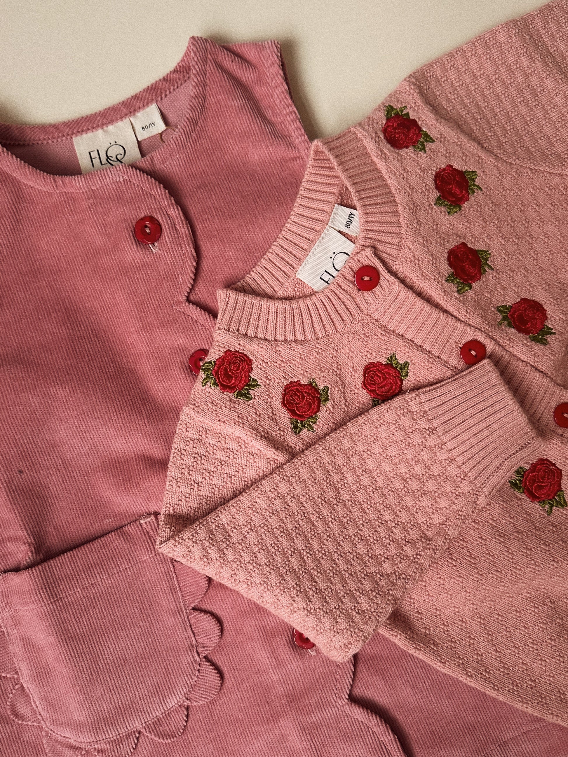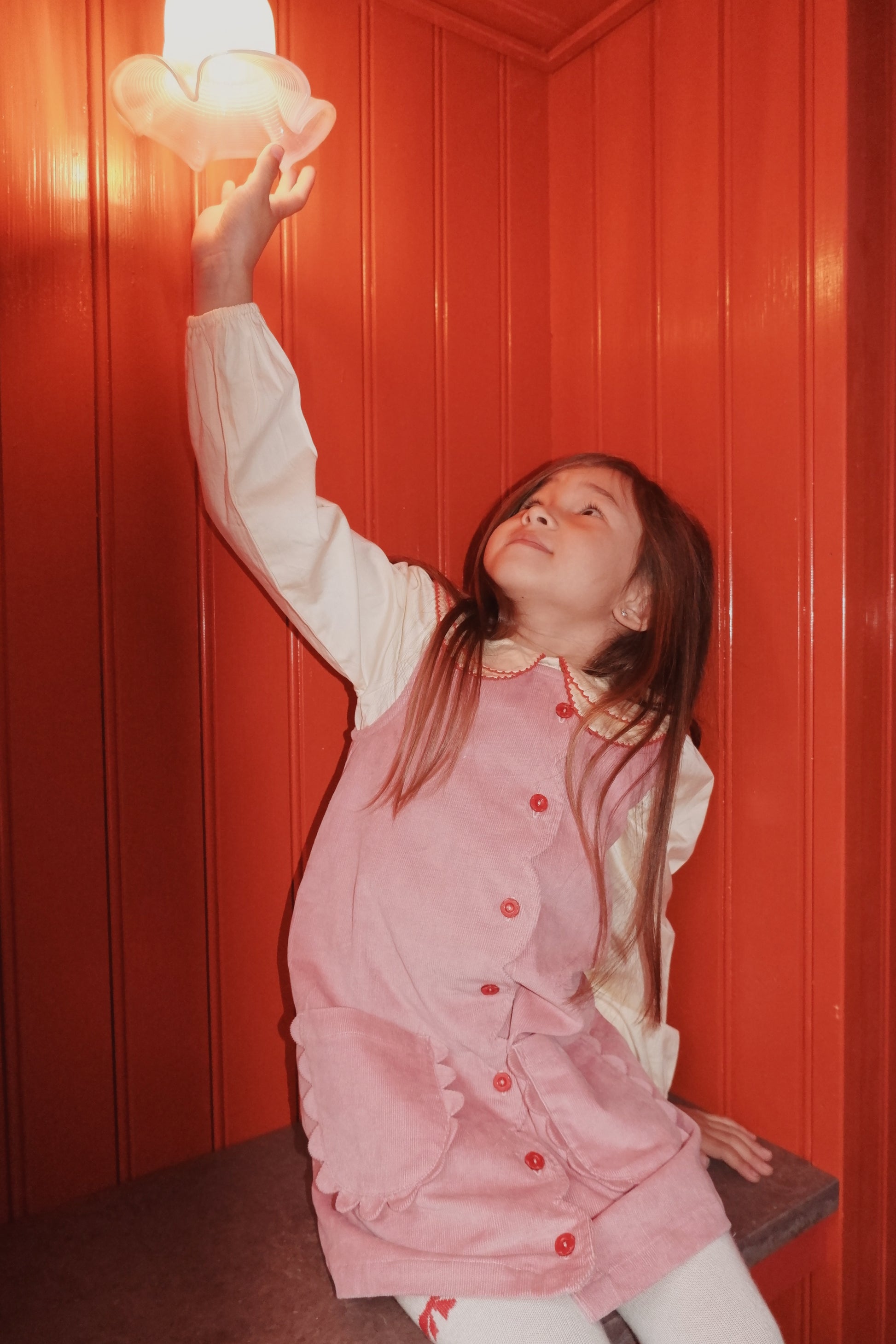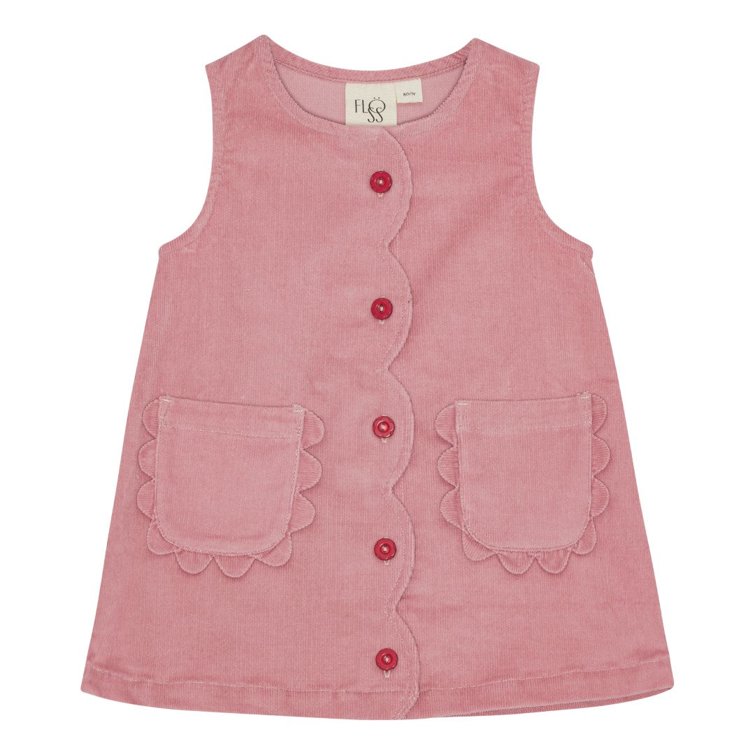 Das Mia Kleid ist aus hochwertigem Baumwollcord gefertigt und besticht durch seinen klassischen, runden Ausschnitt sowie die liebevollen Details. Die beiden Fronttaschen mit zarter Muschelkante und die kontrastierenden roten Knöpfe verleihen dem Kleid einen besonderen Charme.