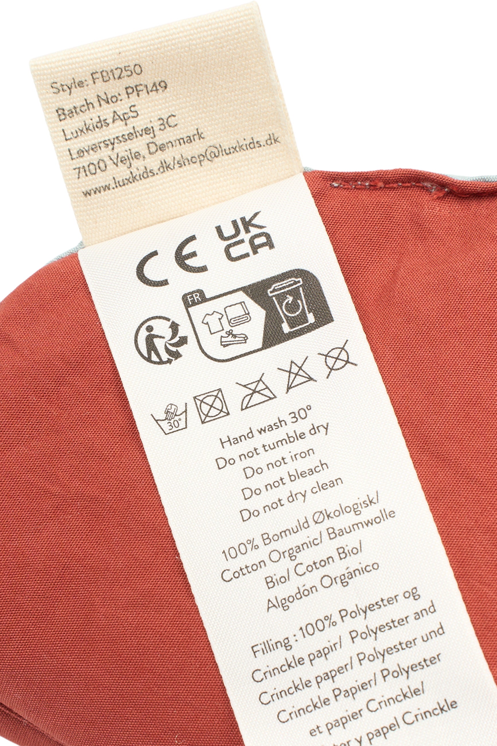 Qualität: 100 % Bio-Baumwolle, Füllung: 100 % Polyester und Knisperpapier