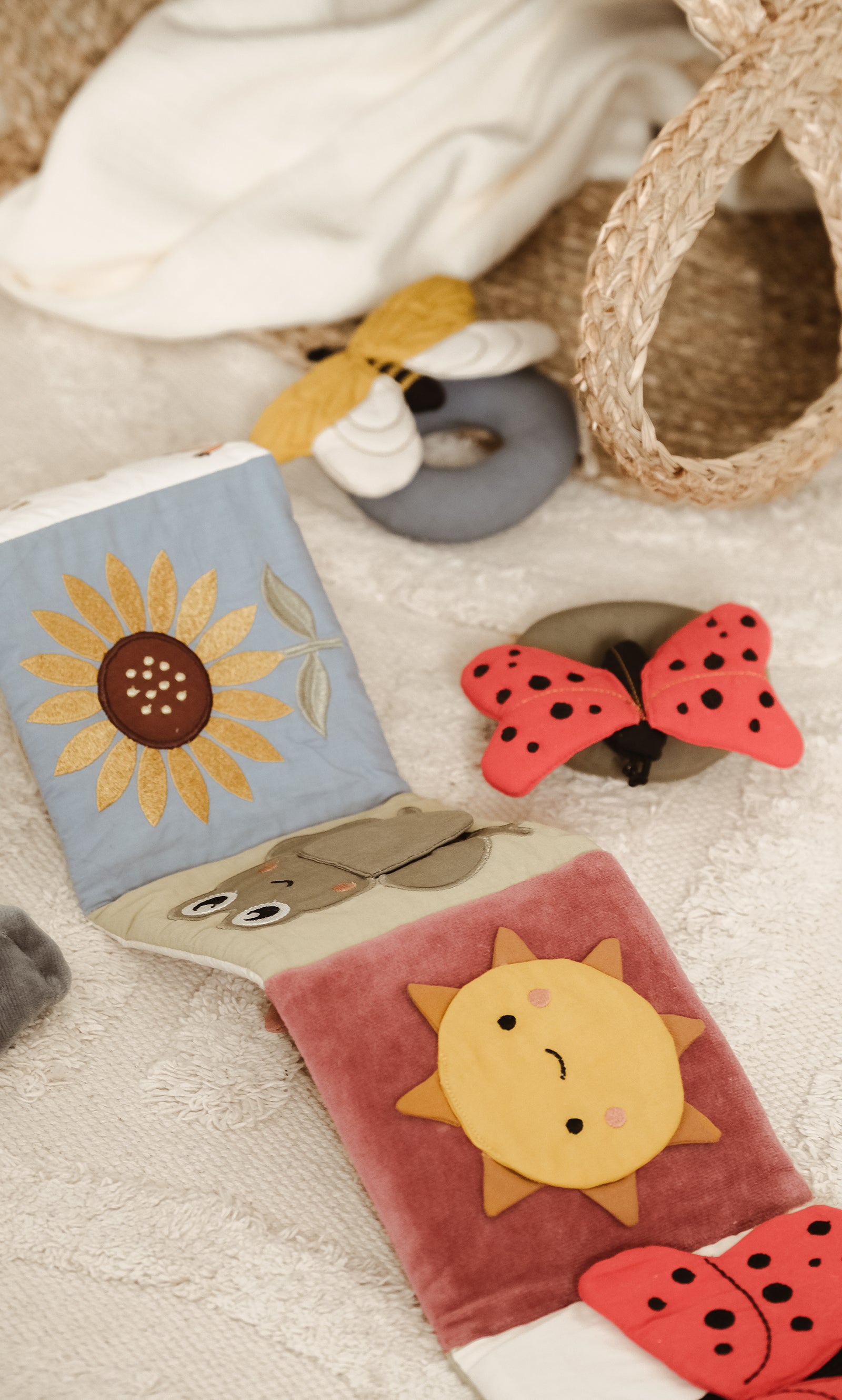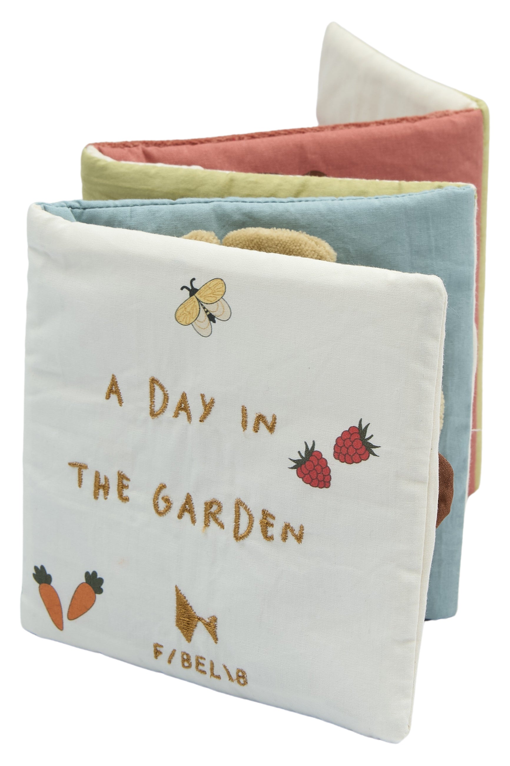 Fabelabs Stoffbuch – Garten nimmt Bär und Hase mit auf eine Reise durch ein blühendes Wunderland. Begleite sie, während sie summende Bienen und bunte Blumen entdecken.