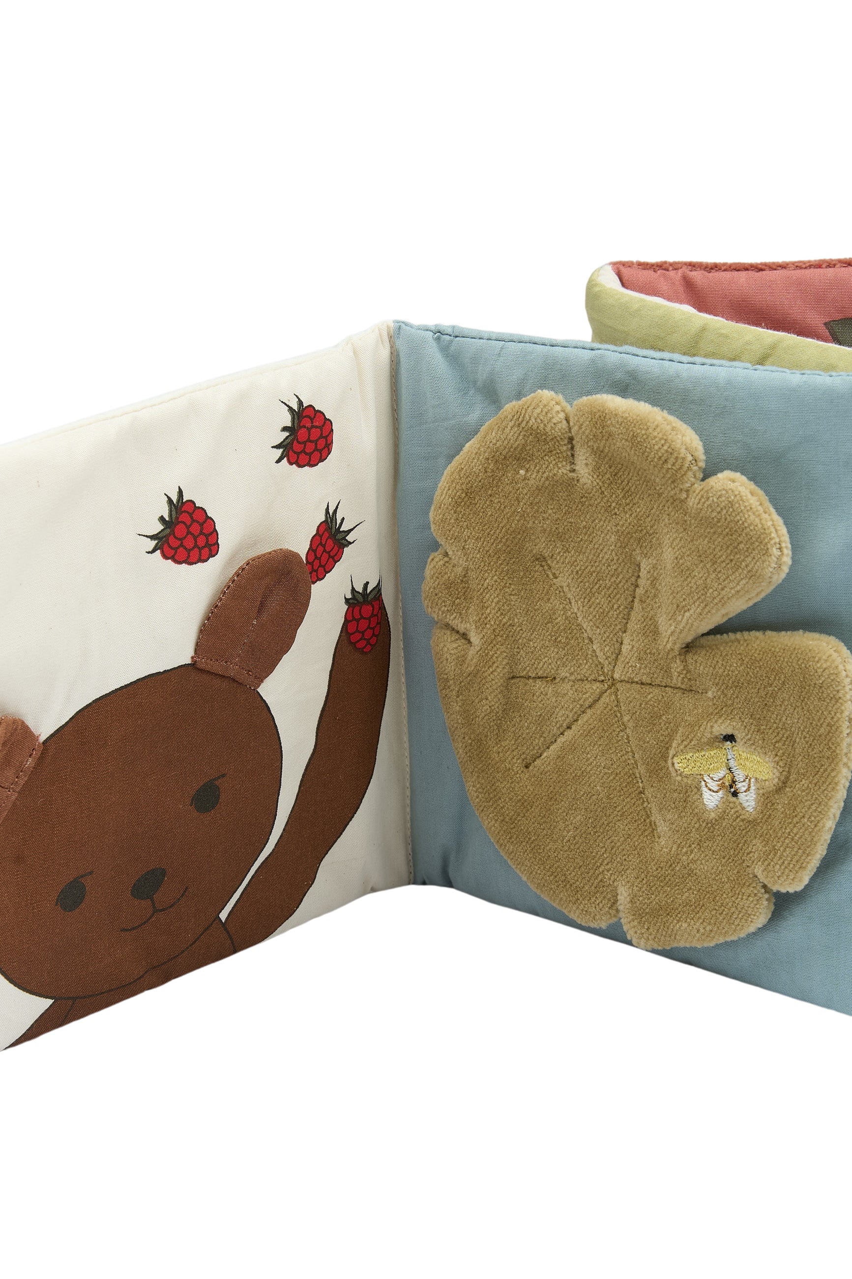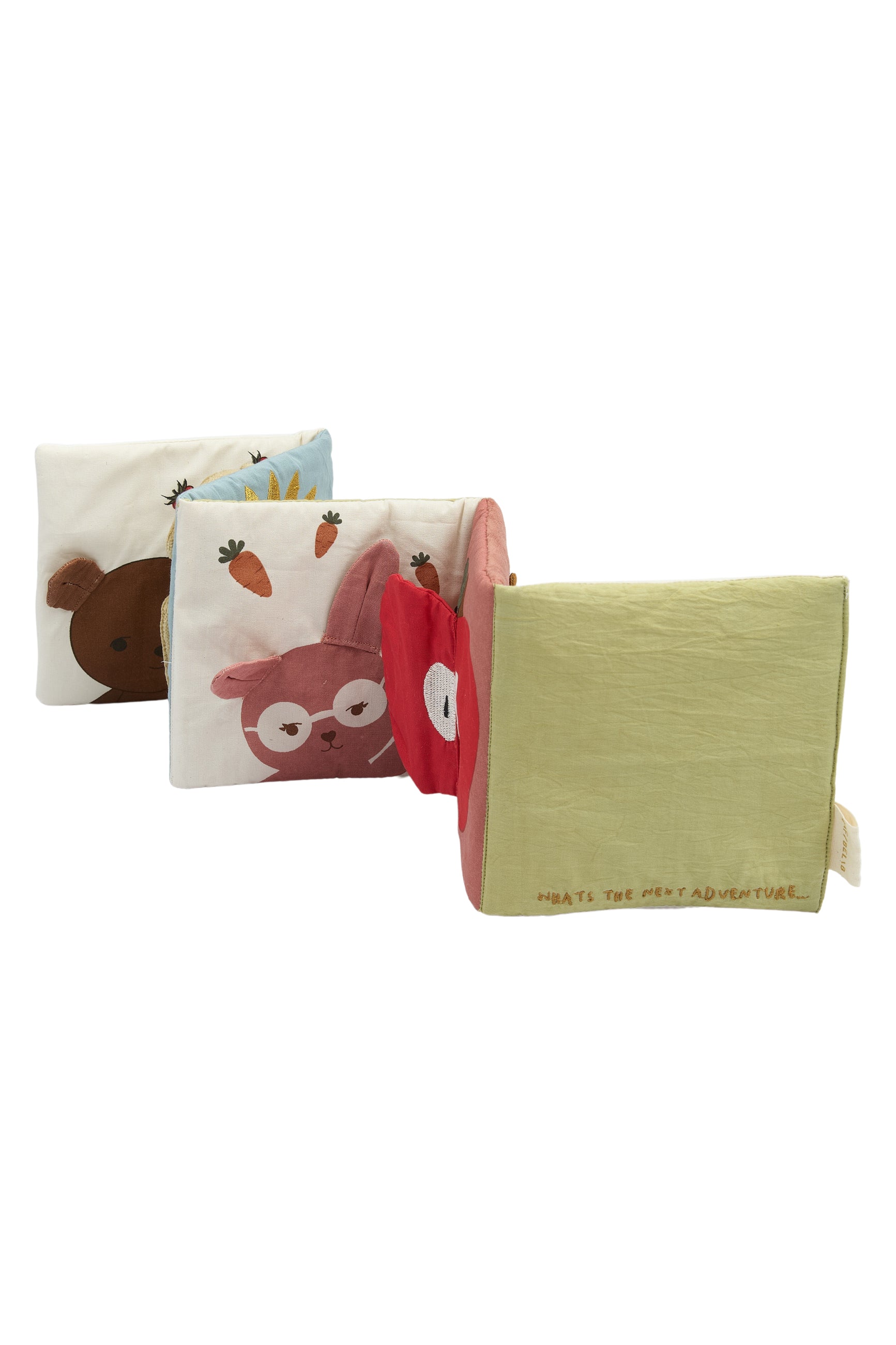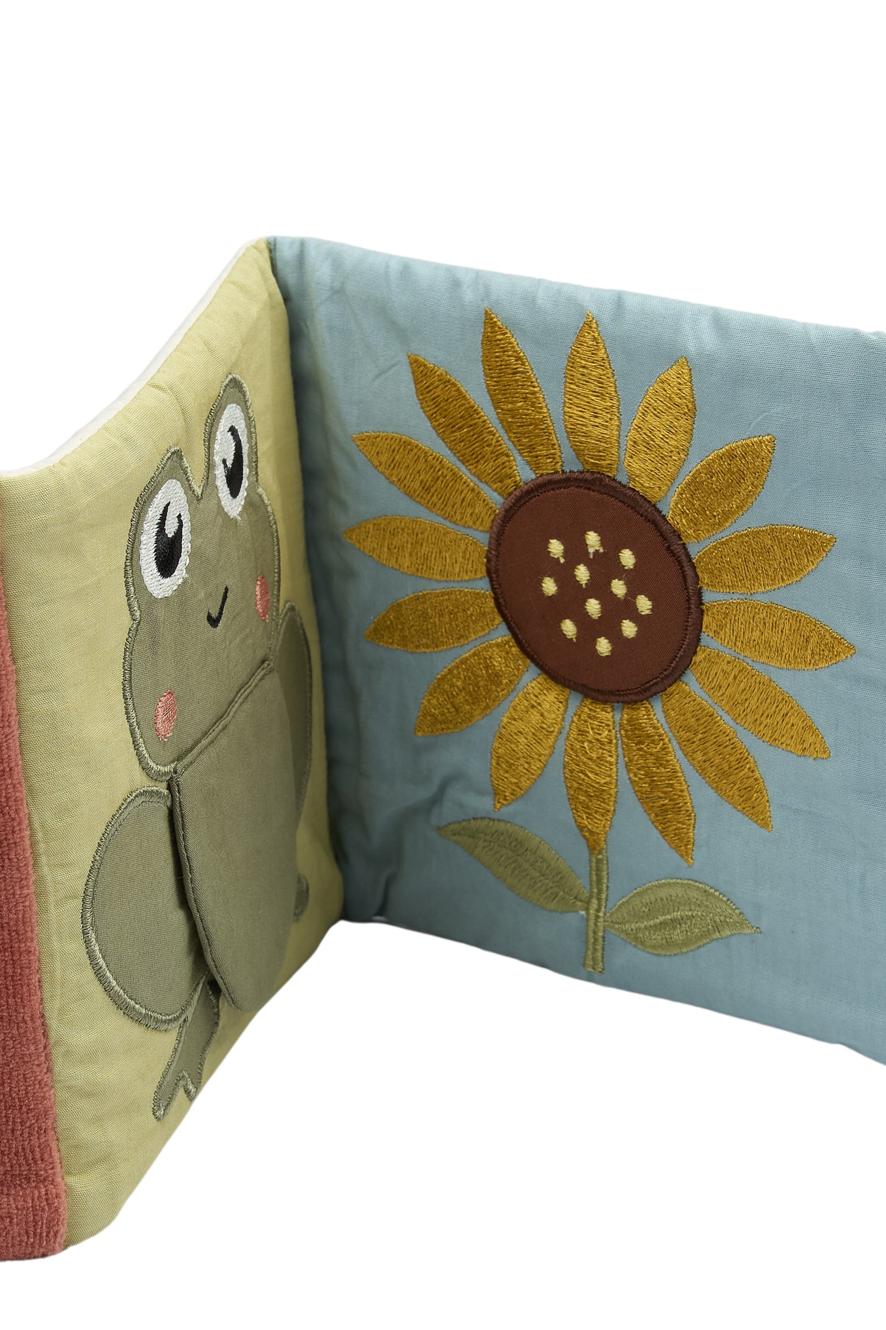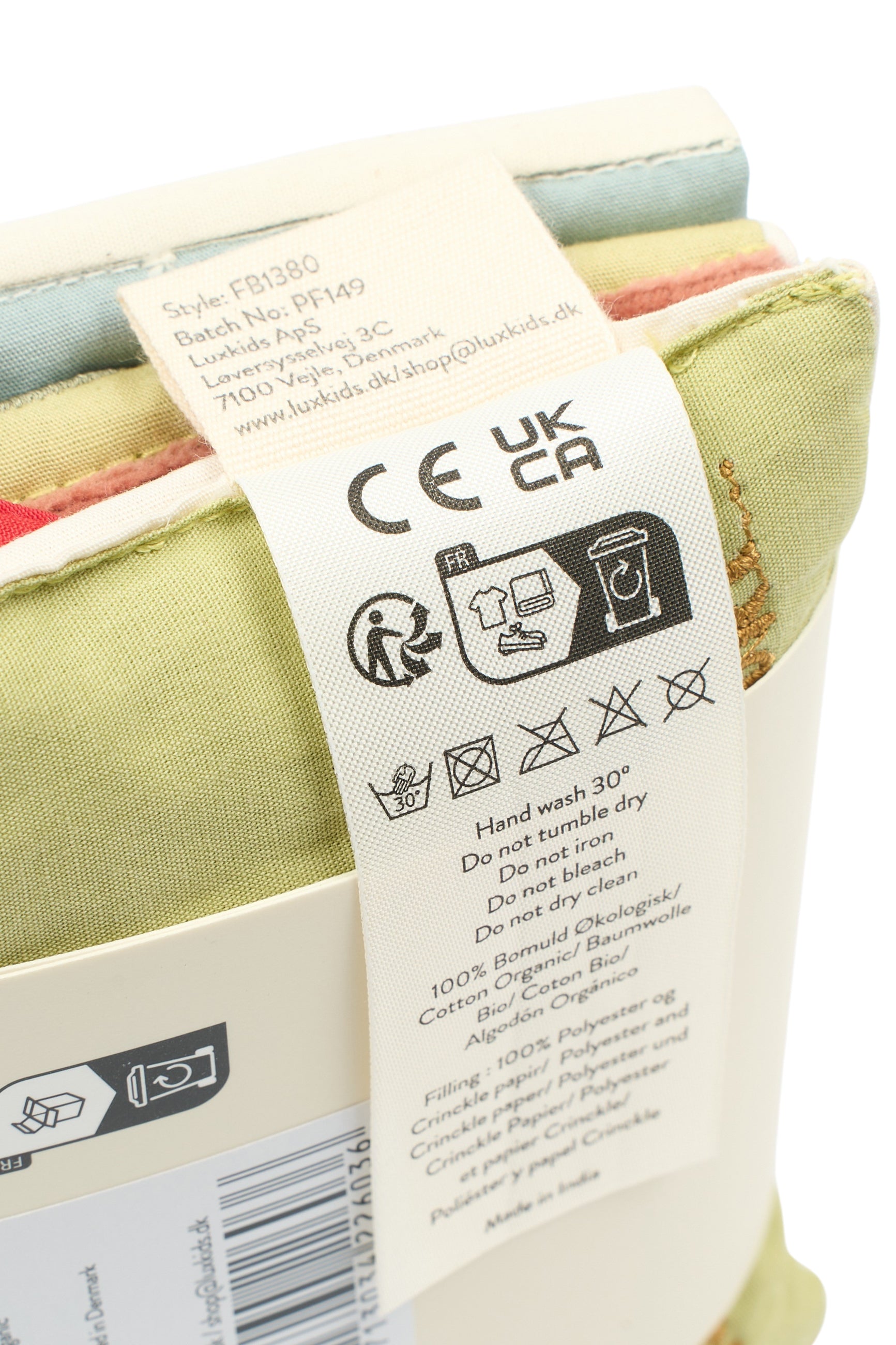 Das Stoffbuch ist aus 100 % Bio-Baumwolle gefertigt. Mit fünf weichen, quetschbaren Seiten, schönen Farben und Raschelpapier sorgt es dafür, dass Babys angeregt werden und fröhlich lachen.