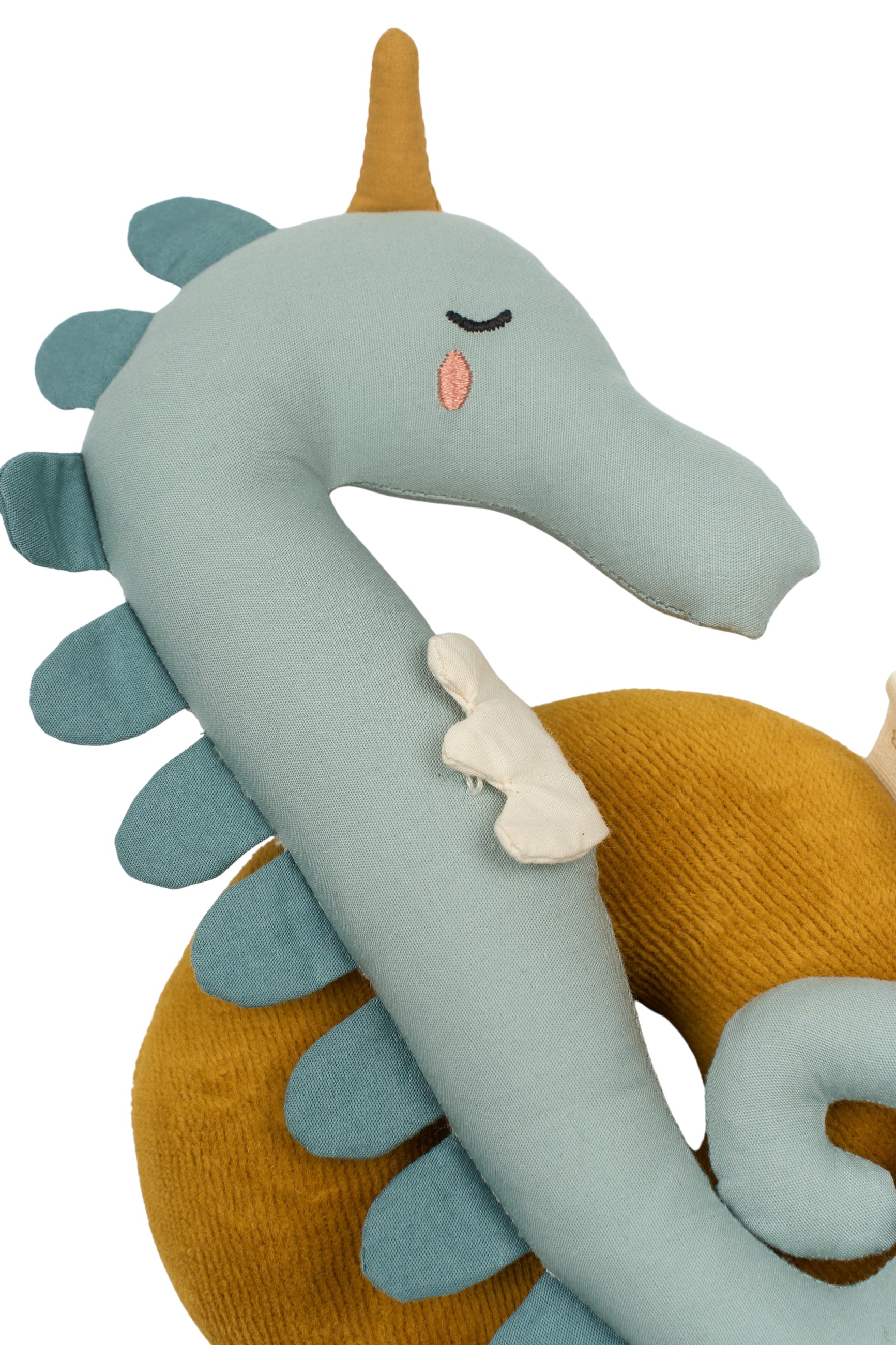 Leicht zu greifen: Die Seepferdchen-Rassel liegt gut in kleinen Händen und lässt sich einfach halten. Der samtige Baumwollstoff bietet eine weiche, taktile Oberfläche, die es Ihrem Baby ermöglicht, unterschiedliche Sinneseindrücke beim Greifen und Schütteln zu erleben. Das sanfte Rasselgeräusch des inneren Rasselmechanismus regt das Gehör an und unterstützt die sensorische Entwicklung Ihres Babys.