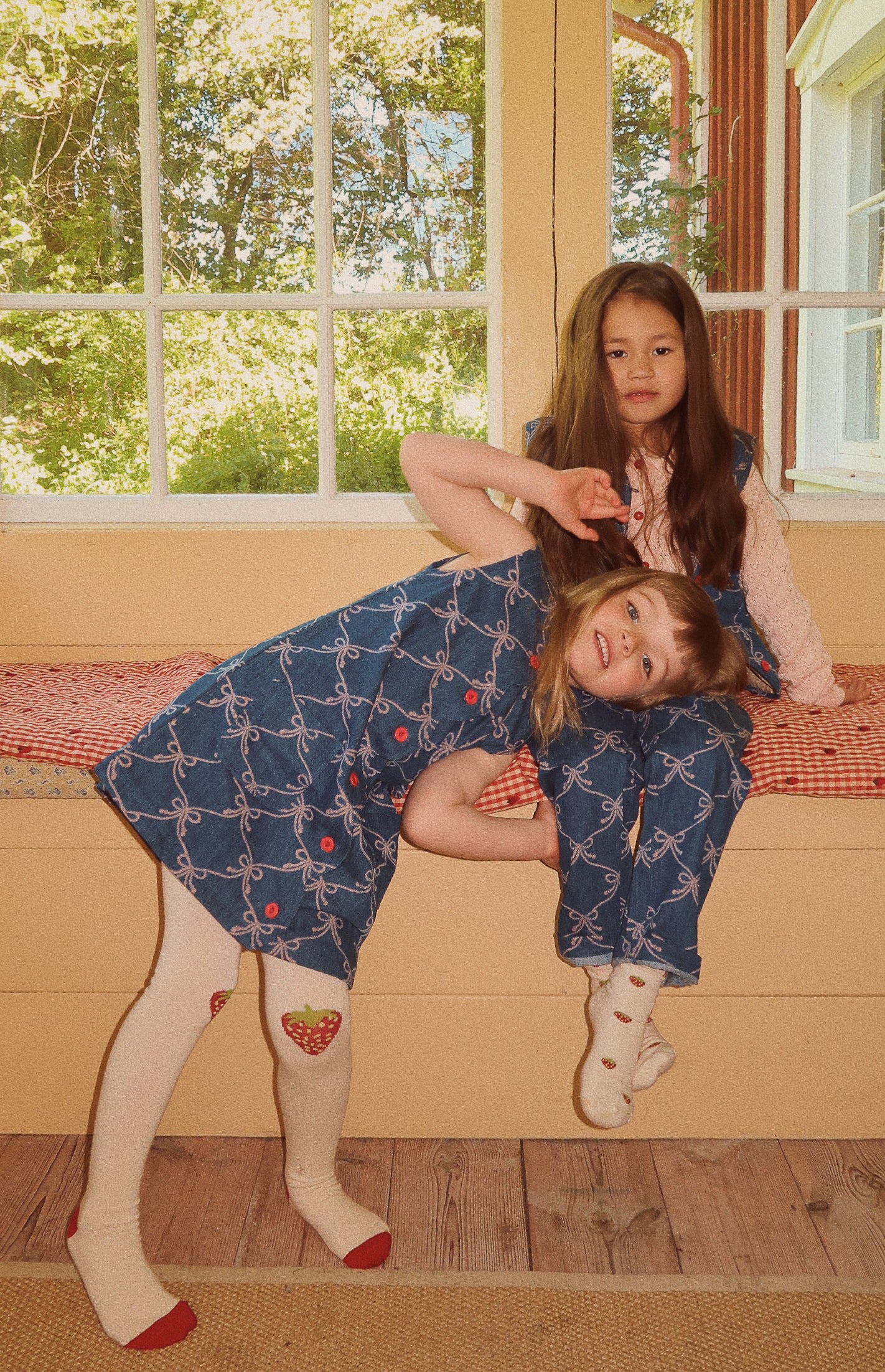 Die Strumpfhosen bestehen aus 75 % Baumwolle und 25 % Polyester. Mit einem niedlichen Erdbeer-Detail, das zu all unseren Kleidern und eigentlich jedem Outfit passt.